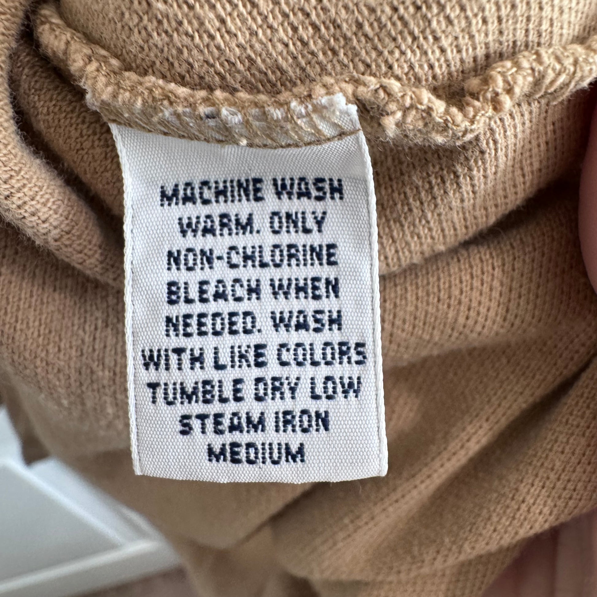Machine wash warm, only non-chlorine bleach when needed. Tumble dry low. Steam iron medium.